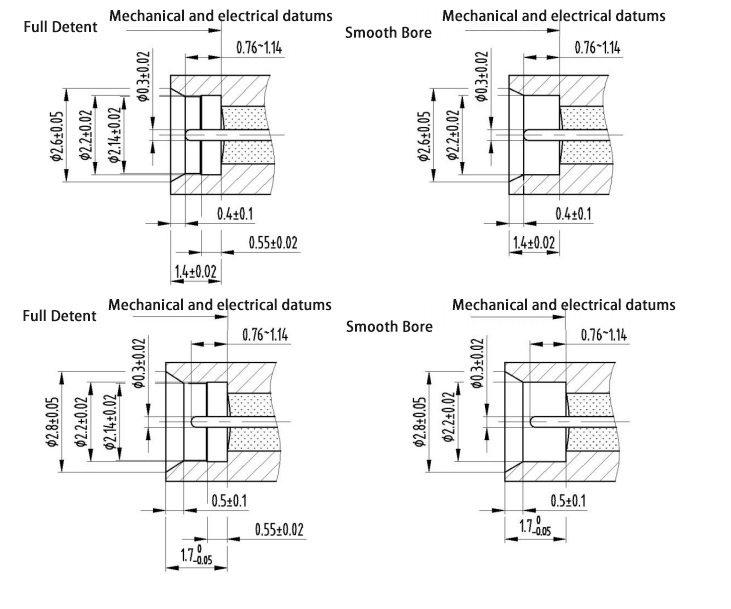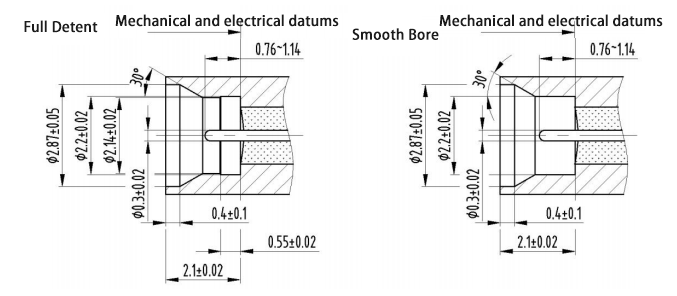 Les connecteurs coaxiaux RF scellés à l'air de type SMPM-J ont deux formes d'interface : échappement complet et trou nu. Lors de la dénomination du modèle, F indique un échappement complet et